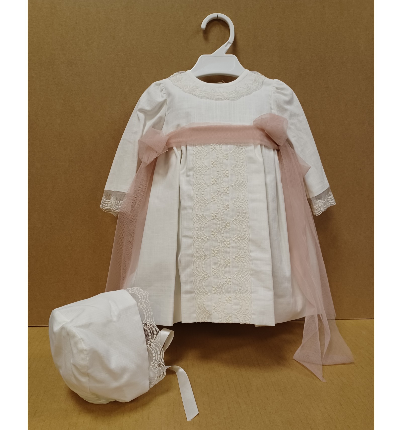 Vestido manga laraga con capota ideal para bautizos y cerebraciones. Cinturón de gasa rosa.
