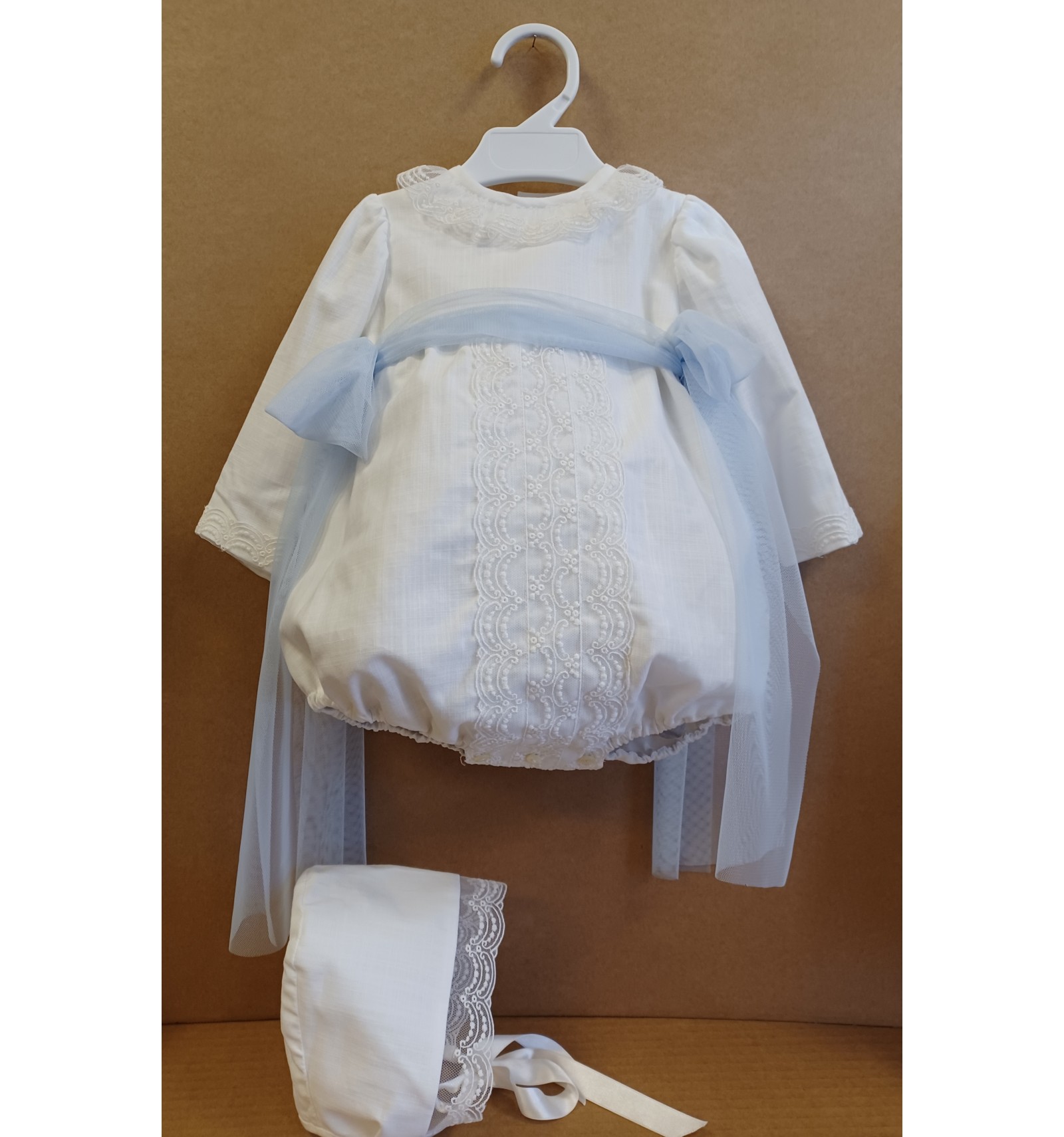 Elegante pelele de bautizo con capota a juego realizado en tejido de lino.